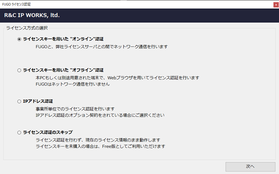 「オンライン認証」を選択した場合、ライセンス認証の際に弊社のライセンス管理サーバにアクセスします。弊社のライセンス管理サーバのアドレスは、license.rc-ipworks.net となります。社内のファイアウォールにより、プログラム(FUGO.exe)の通信が制限されている場合は、管理者の方に上記アドレスとのHTTPS通信ができるようにご依頼ください。通信制限を回避できない場合は、「オフライン認証」をご利用ください。