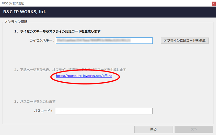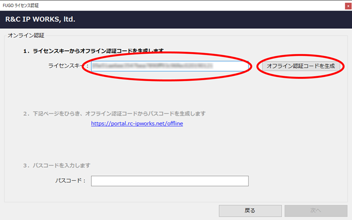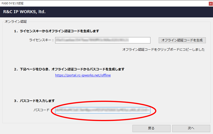 FUGOを利用するPCのライセンス認証画面に戻り、取得したパスコードを入力し、「次へ」ボタンをクリックしてください。パスコードを用いてライセンス認証が実行されます。