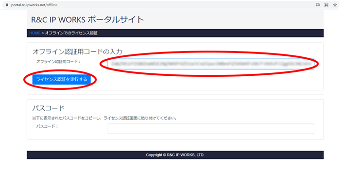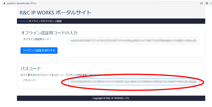 先のWebページ画面下に、ライセンス認証に用いる「パスコード」が表示されますので、コピーしてください。