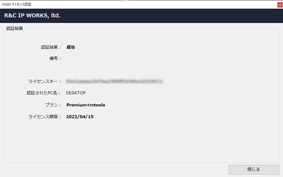 正常にライセンス認証が行われますと、認証されたPC名、プランとライセンス期限が表示されます。