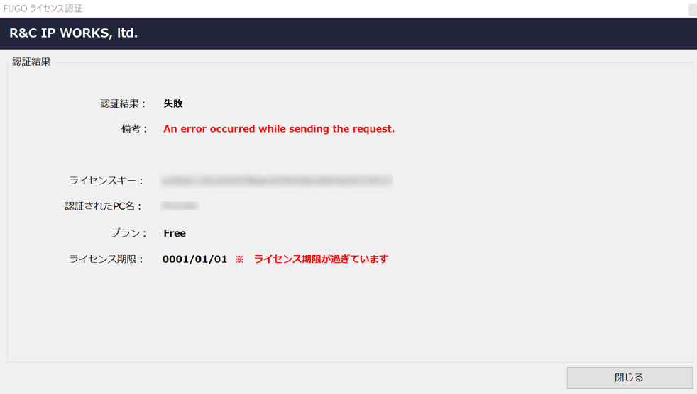 なお、弊社のライセンス管理サーバと通信ができない場合、オンライン認証に失敗し、下図のように "An error occurred while sending the request." というエラーが表示されます。この場合、強制的にFree版となります。
