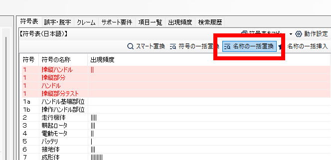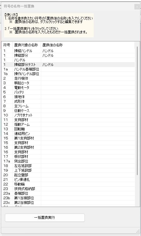 名称 の一括置換 特許明細書中の 符号の名称 を、安全かつ手軽に別の名称に置換する機能になります。 つかいかた 「名称の一括置換」ボタンをクリックしてください。 符号表が表示されるので、置換したい名称に関して、「置換後の名称」を選択し、入力してください。