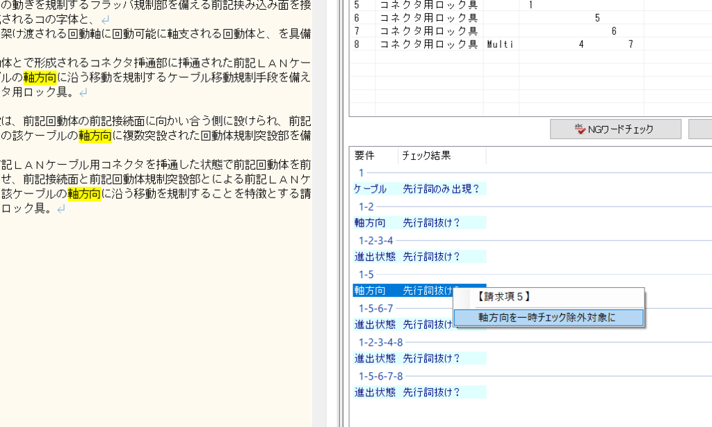 クレームの前記の記載チェック結果を確認する際、チェックする必要のない単語(要件)を右クリックして「xxxを一時チェック除外対象に」を選択してください。