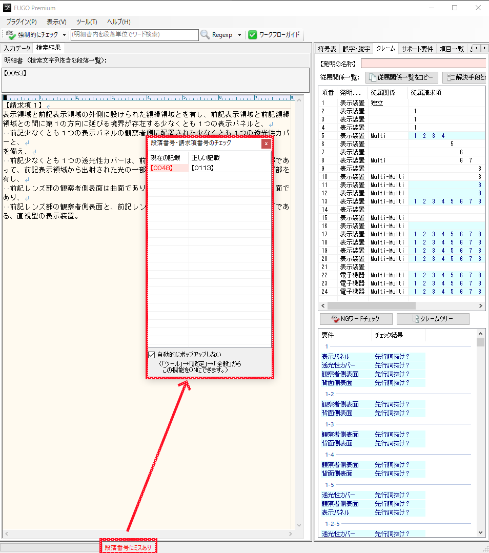段落番号や請求項番号に記載ミスがあった場合には、画面下部に赤文字でその旨が表示されます。また赤文字をクリックすると、ポップアップウィンドウで記載ミスの詳細が表示されます。