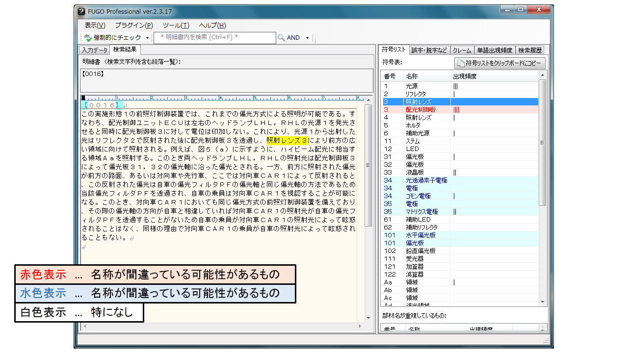 - 例えば、明細書中の一部で「ネジ10」と書くべきところを「ネジ11」と記載した場合、このリストに上下に並んで表示されます。